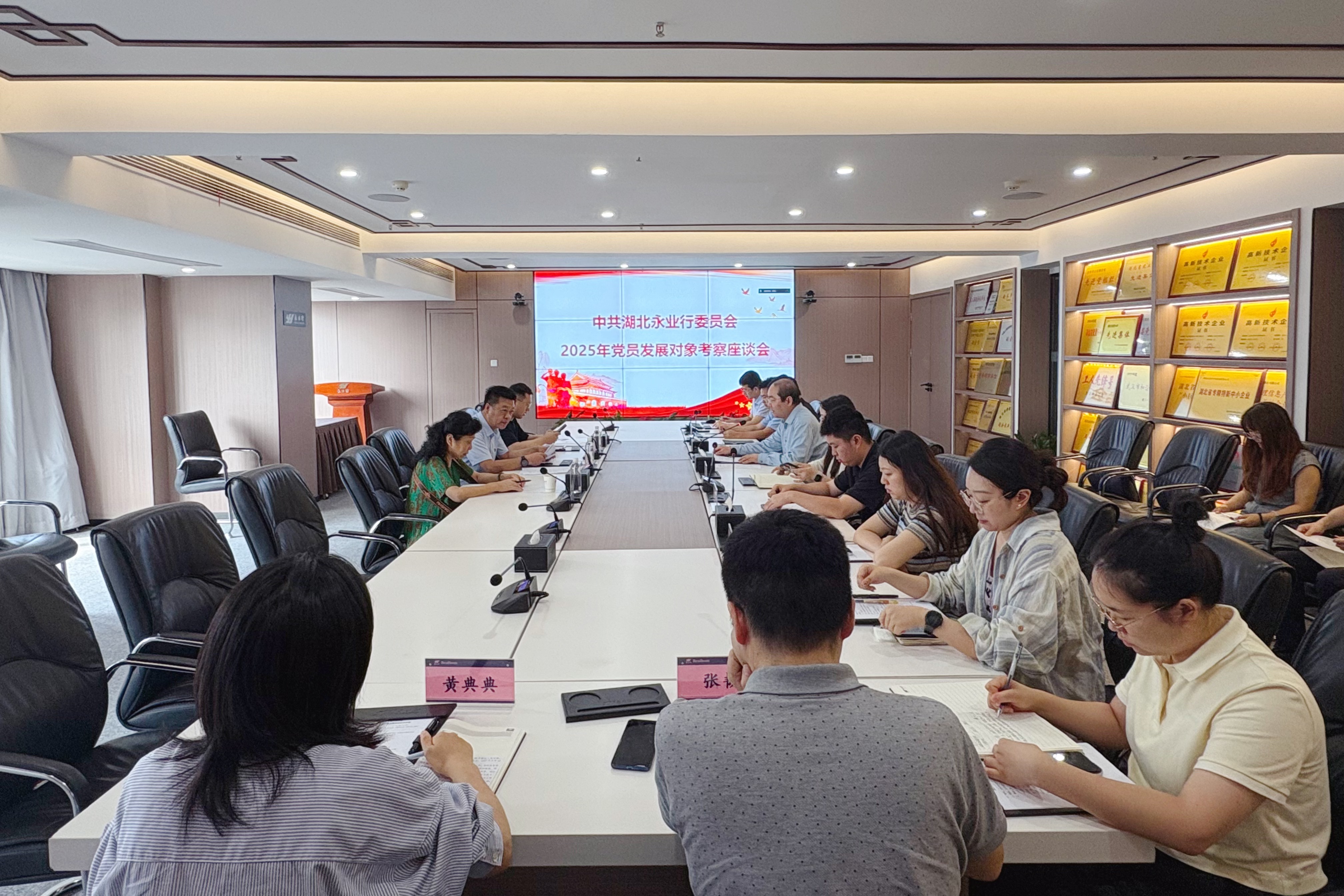 2025年6月16日,武昌区委统战部副部长、区工商联党组书记、会员企业党委书记吕志新,武昌区工商联会员企业党委党建指导员李祖豪,专职党建指导员郭群一行莅临永业行,对本年度党员发展对象进行考察座谈。永业行党委委员、常务副总裁吴学锋,组织人事部副总监操梅,各支部党员发展对象及党员群众代表参加座谈。